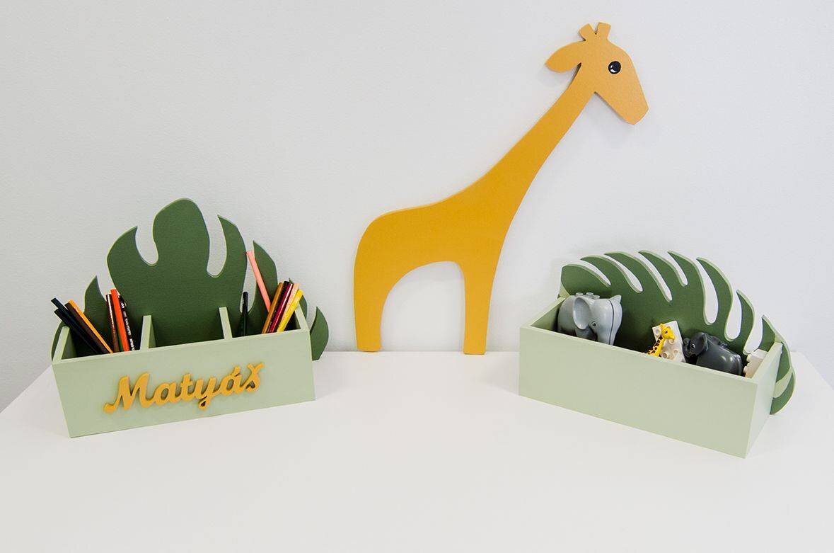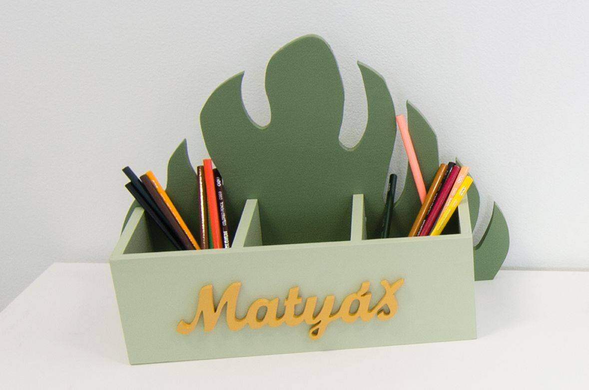 Box na psací potřeby s listem monstery z kolekce "Jungle", stylově doplní váš pokojíček! Na boxu může být dřevěné jméno, aby bylo jasné, čí pastelky jsou! Je ale tak univerzální, že v něm klidně může být mobil, nabíječka, nebo třeba sběratelské kartičky a jiné poklady pokojíčku.