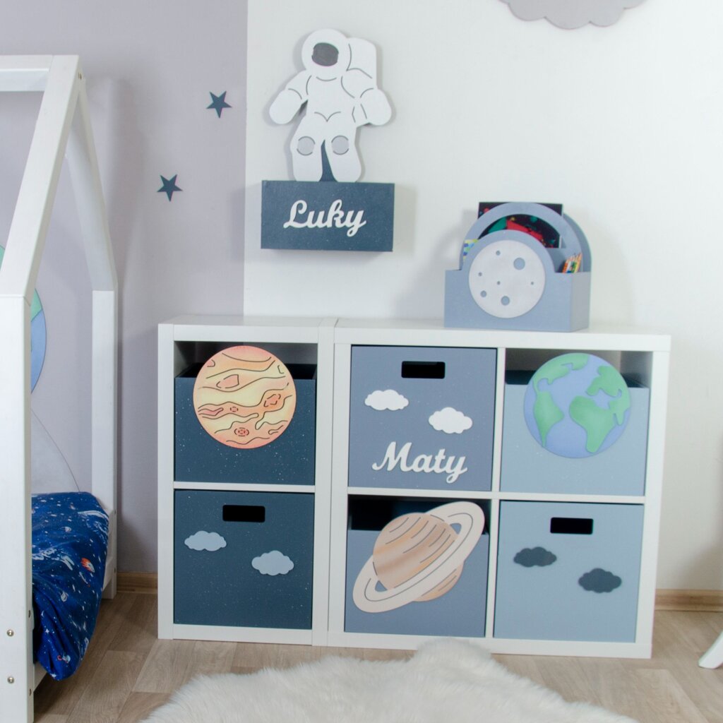 Sada 4 ks dřevěných boxů s planetami Venuše, Saturn, se jménem a obláčky, nadchne každého malého astronauta! Vesmírný pokojíček je skvělým nápadem pro větší kluky. Boxy v této hluboké, modré barvě, s efektem drobných hvězd, vypadají jako noční obloha. Svými rozměry boxy pasují do spousty standardních regálů, např. do oblíbeného Kallax regálu z IKEA. Vejde se do nich spousta hraček, stavebnic, kostek, autíček...